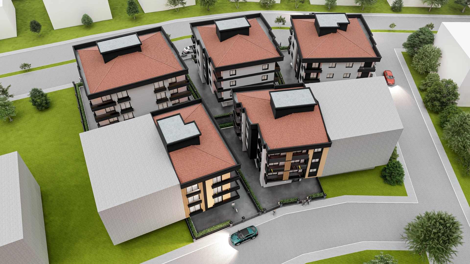 Minel Evleri’nin mimari karakteri; modern çizgiler, güçlü renk geçişleri ve dengeli kütle kompozisyonu üzerine kuruludur.